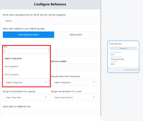 1. Keyword Triggering: To initiate the bot using specific keywords,double-click on the `Start Bot Flow` element. This action will open the `Configure Reference` in the left side, featuring ten fields and two buttons. In the first field, you can input a list of comma-separated keywords. When a user enters text in the messaging window that matches any of these keywords, the bot will be triggered.